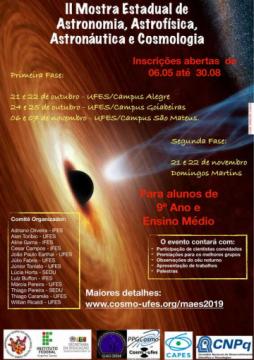 Estão abertas as inscrições para a II Mostra Estadual de Astronomia, Astrofísica, Astronáutica, e Cosmologia. Podem participar alunos a partir do 9º ano do ensino fundamental e do ensino médio do ES, que deverão ser orientados por um professor na apresentação de seus projetos científicos, escolhendo uma das áreas de conhecimento: astronomia, astrofísica, astronáutica ou cosmologia.