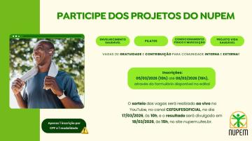 Projeto de Extensão Núcleo de Pesquisa e Extensão em Ciências do Movimento Corporal (NUPEM) divulga edital 2026 para preenchimento de vagas em atividades físicas orientadas no Centro de educação Física e Despostos.O certame prevê vagas em atividades como musculação, pilates e muito mais.